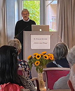 Seinen Vortrag hielt er in seiner Funktion als Vorstandsmitglied des „Netzwerk Ambulante Ethikberatung Göttingen e.V.“ (NEG). Dieses ist am Institut für Allgemeinmedizin der Universitätsmedizin Göttingen angesiedelt und bietet Beratung in Konfliktsituationen schwer kranker Menschen, auch in Heimen, an. Insbesondere könne eine ethische Fallberatung hilfreich sein in komplexen, konflikthaften oder unklaren Situationen, wenn eine Einigung auf ein angemessenes Vorgehen im Sinne des Bewohners bisher nicht erreicht werden konnte. Ein praktisches Beispiel diente dem Verständnis und zeigte das Dilemma, das entstehen kann, wenn sich Angehörige, Pflegepersonal und Arzt nicht einig sind und der Bewohnende sich nicht mehr äußern kann.